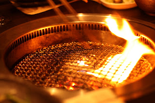 After ordering, the waiter bring a cube of fat to the table. Using bamboo tongs, the fat is rubbed on the grill to keep the meat from sticking. Now comes the exciting part…