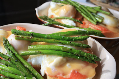My mom used to make eggs benedict on Sunday mornings every once in a while. Her hollandaise sauce was always so creamy and flavorful and soaked in perfectly to the toasted english muffins along with the egg yolks. The canadian bacon sandwiched between the bread and egg added just the right amount of salty flavor to round out the meal. This was my first attempt at making my own eggs benedict and I made a couple of small changes. Rather than using english muffins, I used fresh baked white bread from a bakery down the street. In place of Canadian bacon I used smoked salmon. Lastly, I added a side of sauteed asparagus.