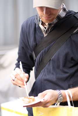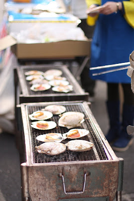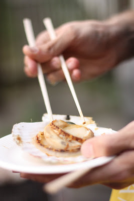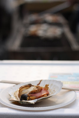 At the last stand, on two small grills, a man was cooking fresh (still in the shell) scallops. The scallops were placed on the grill in their closed shells and as each popped open, the top shell was lifted to reveal a juicy, salty scallop. As they cooked over the smoky grill, they were drizzled with a bit of soy sauce and served on a paper plate with wooden chopsticks.