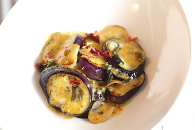 Heat the olive oil in a medium saucepan over medium heat. Add the garlic and sautee until fragrant, about 2 minutes. Add the eggplant and sautee until lightly browned, about 2 minutes per side.