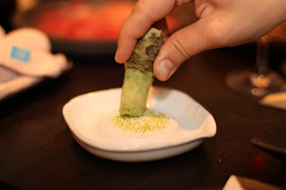 The waiter sets three different dipping options in front of each person at the table. One is soy sauce, to which you add freshly grated wasabi (another do-it-yourself experience), the second is a sesame sauce, and the third is a delicious salt flavored with what I think was sesame.